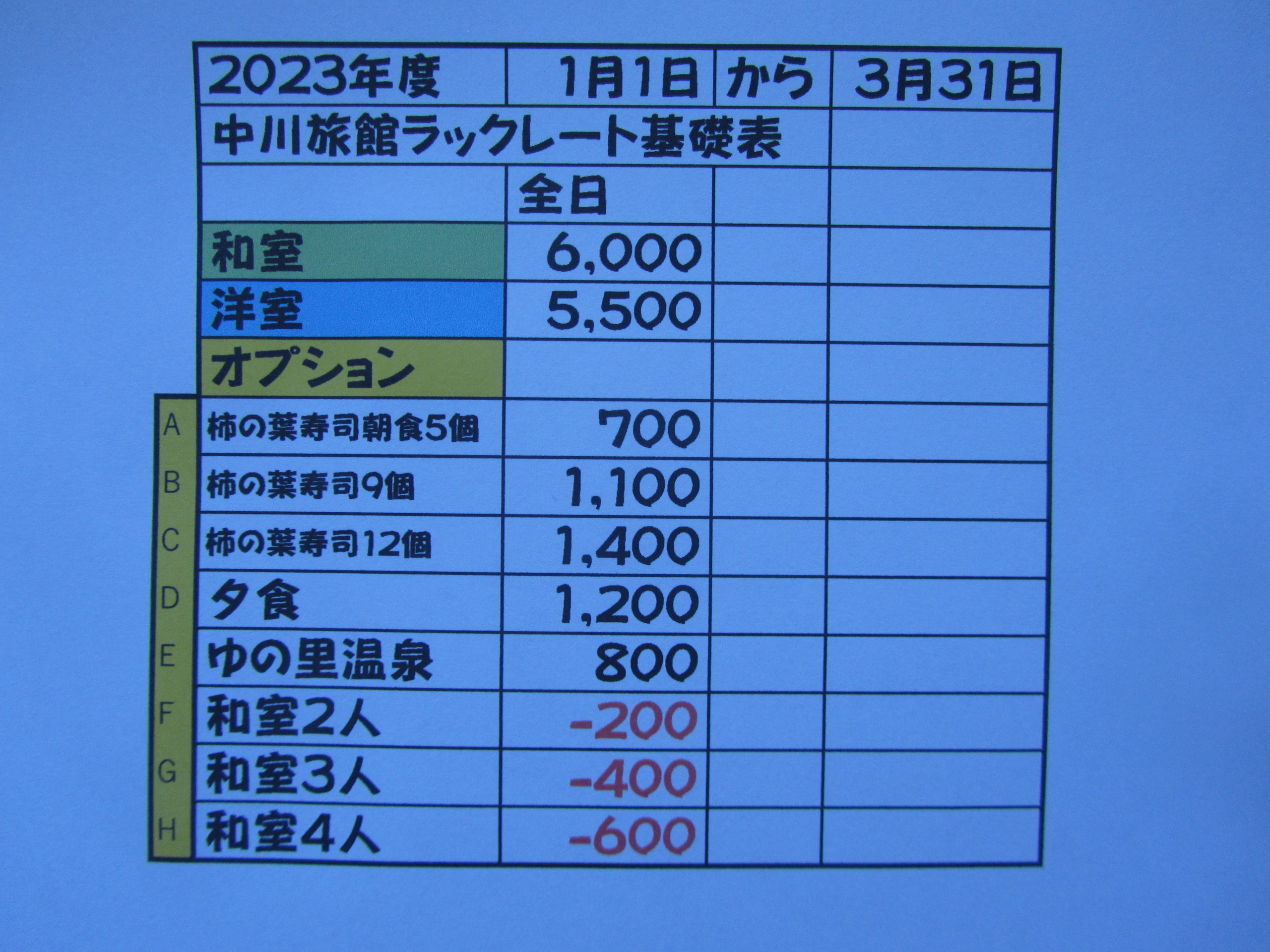 2023年度ラックレート発表 2022 11/10 お知らせ 2022年11月10日 昨年度からの物価高騰(灯油85円→135円)等のため2023年度のラックレート旅館料金表を500円アップして発表させていただきます。只週末客の利便を鑑み500円増しを止めフラットレートとさせていただきましたのでご理解いただくようお願い致します。 お知らせ 朝食のご案内 中川旅館への経路 関連記事 行楽シーズン 2025年11月7日 町石道通行止め解除されました 2025年10月16日 宿泊業界における観光と金融に関する全国懇談会参加 2025年9月12日 令和7年度上期ラックレート発表 2025年2月11日 九度山地図 2024年11月10日 お客様からの情報 2024年11月8日 高野山町石道最新情報 2024年9月13日 2024年度下期ラックレート発表 2024年8月25日