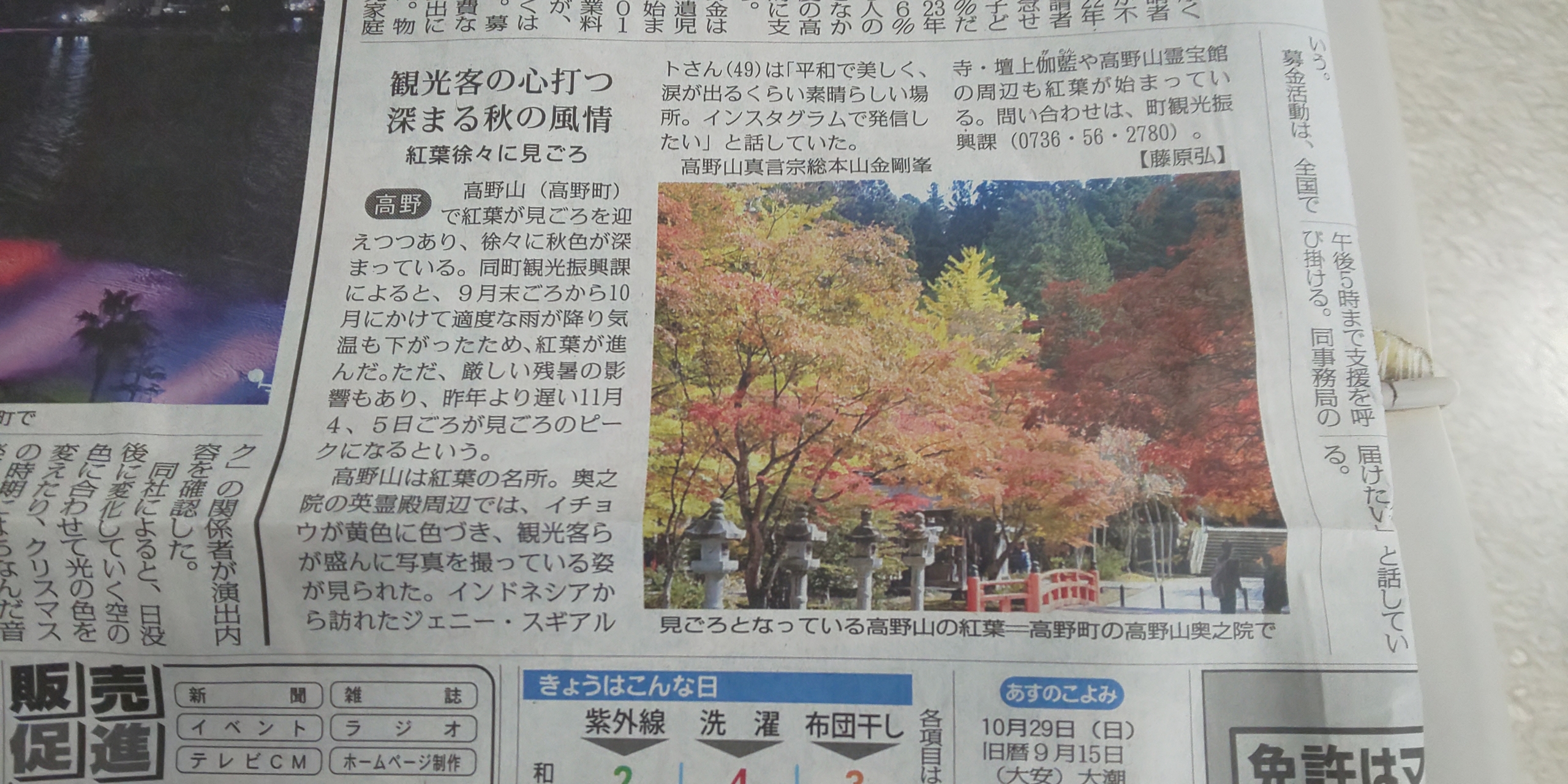 紅葉見物とジャズライブ 2023 10/29 お知らせ 2023年10月29日 2023年10月29日 昨日宿泊されたお客様は沖縄から来られました。夜には近くのジャズライブ古民家レストランにお連れし大満足でした。トマトチキンが美味しかったとのこと。翌日は沖縄にはないという高野山の今盛りの紅葉を見物に行くそうです。カーナビでは指示ない快適に走れる国道480号線をお教えしました。涙が出るくらいの素晴らしい休日を!(画像記事 毎日新聞提供) DSC_1997 お知らせ 高野山町石道登山について 旅館の住所位置 関連記事 行楽シーズン 2025年11月7日 町石道通行止め解除されました 2025年10月16日 宿泊業界における観光と金融に関する全国懇談会参加 2025年9月12日 令和7年度上期ラックレート発表 2025年2月11日 九度山地図 2024年11月10日 お客様からの情報 2024年11月8日 高野山町石道最新情報 2024年9月13日 2024年度下期ラックレート発表 2024年8月25日