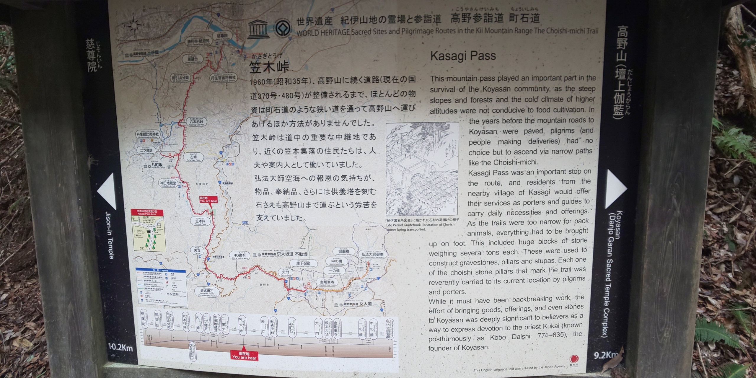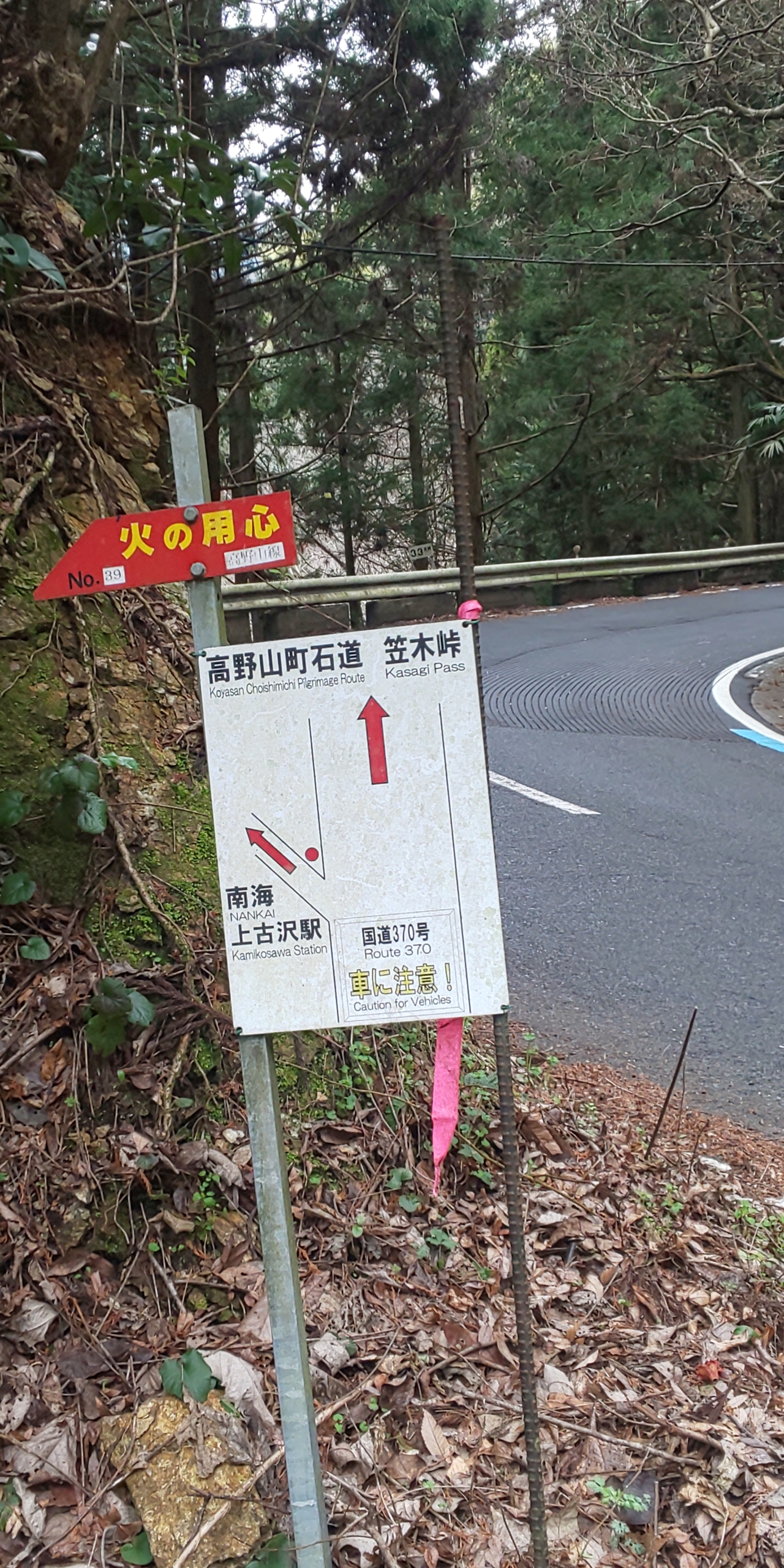 平安時代1088年2月24日白河法皇が高野山ご参詣の折笠木坂に御座所を設けられたという扶桑略記の記録に沿って九度山から古沢を通り笠木峠に至る参詣道を辿ってみました。8時12分九度山駅発南海電車で上古沢駅へ8時25分着。線路沿いに南へ進み不動谷川の滝壺まで降り国道310号線を越え笠木集落へ向かいます。集落入り口には9時半頃到着。ここから急なジグザク斜面を笠木峠へ向かう。標高差300Mはあるだろう。御座所跡は現在空き家らしいが案内板がないので特定できない。木の上という家(名前も法皇からいただいたそうだ)笠木峠には11時頃到着。そこから世界遺産町石道86町石から矢立の60町石まで歩いて矢立茶屋の焼き餅を食べ、帰路は近畿自然歩道で紀伊細川駅へ約40分。九度山駅には1時半頃帰ってきました。紀伊細川からの登山は初心者用、上古沢からのルートは健脚向きとしての高野山への町石道登山に最適だ。