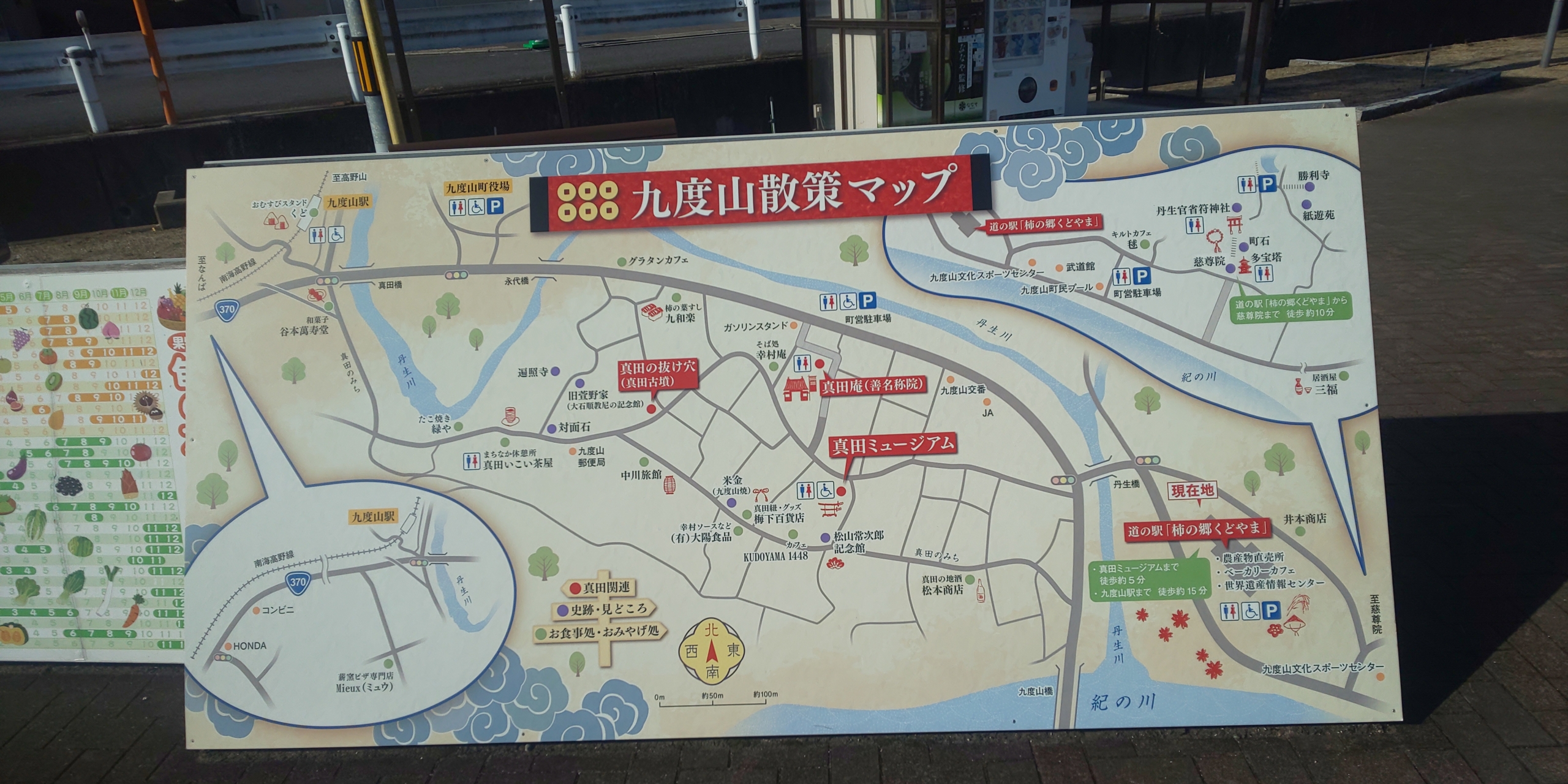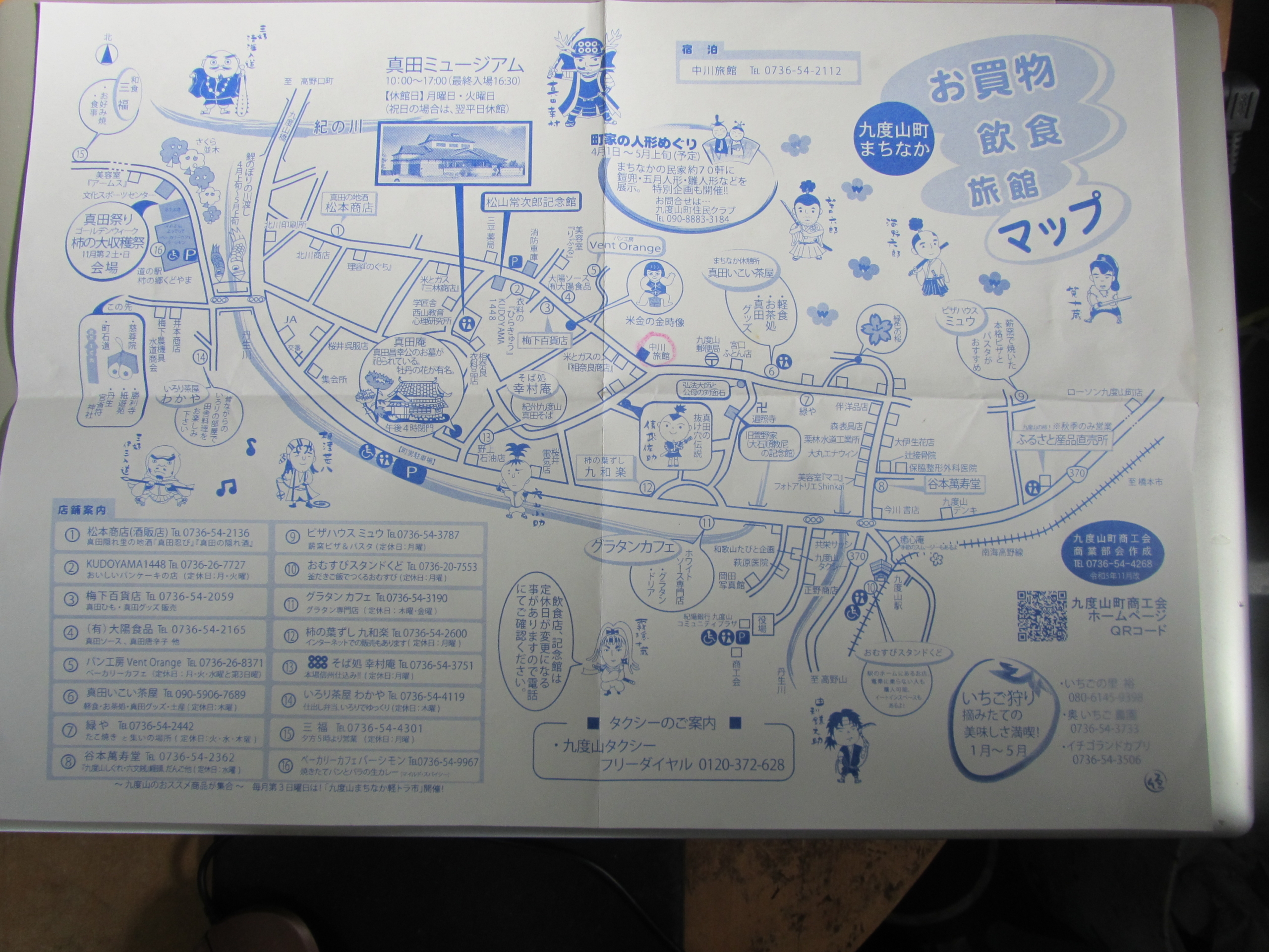 地図は南北表示が反対になっています。中川旅館に車で来る場合は左端の九度山駅前五叉路を真田のみち商店街通りを道なりに進み九度山郵便局過ぎて4軒目右側 駐車場は旅館の斜め前塩の看板前か郵便局と旅館の間にある下が茶色の広場です。又は九度山橋を渡ってくる場合は橋を渡りすぐ斜め左の坂道を道なりに河岸段丘の坂道を登るとアストモスガスの看板が見えたらすぐその左斜め前です。この道は朝の1時間だけ東から西へ7時半から8時半まで一方通行(間違っている地図表示では西から東)となりますが通常交互通行できますが電柱がたくさんあり走行注意です。