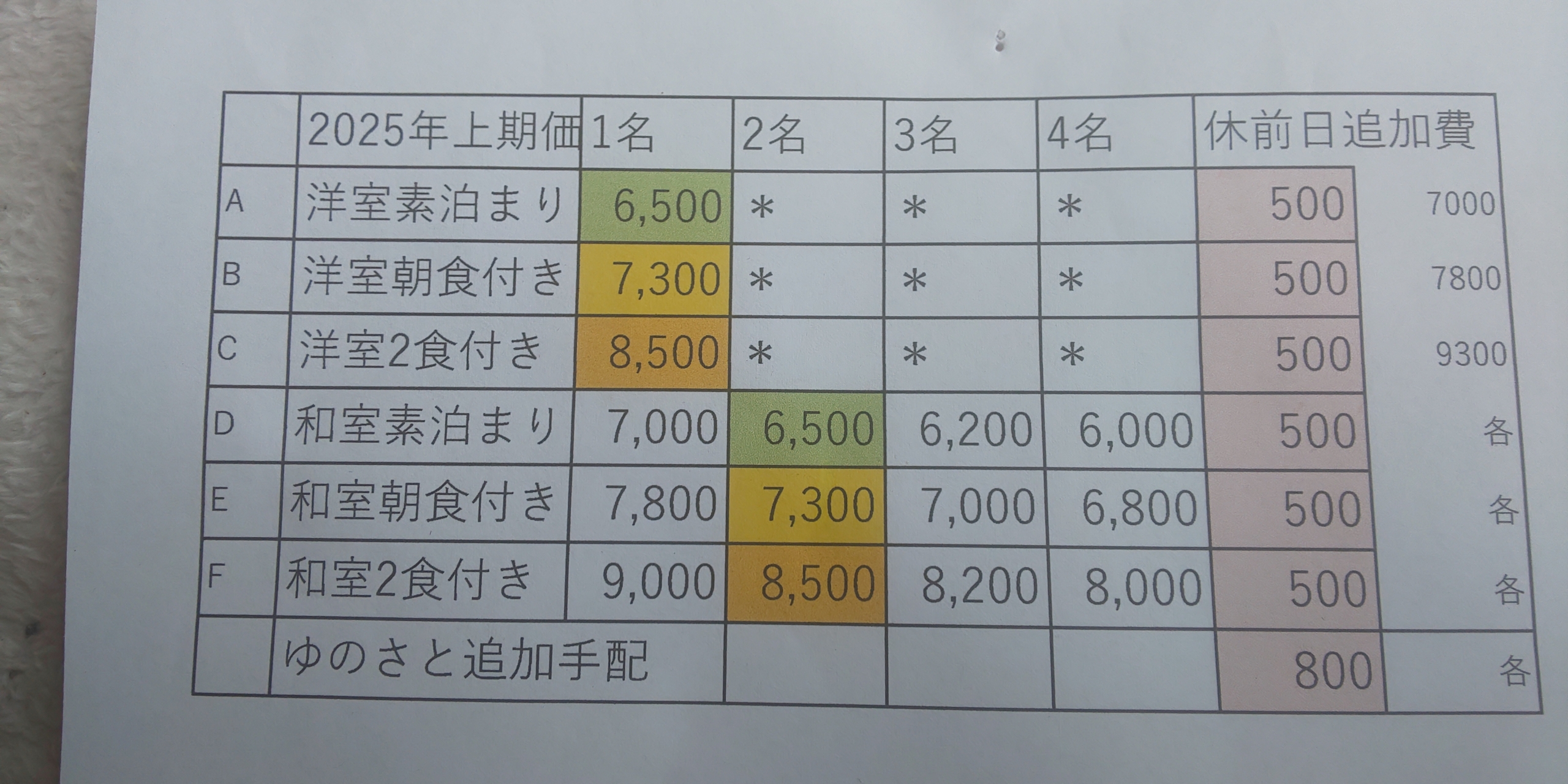 2025年4月1日から9月30日までの宿泊料金等ラックレートを楽天トラベル、じゃらんネット等に発表しました。