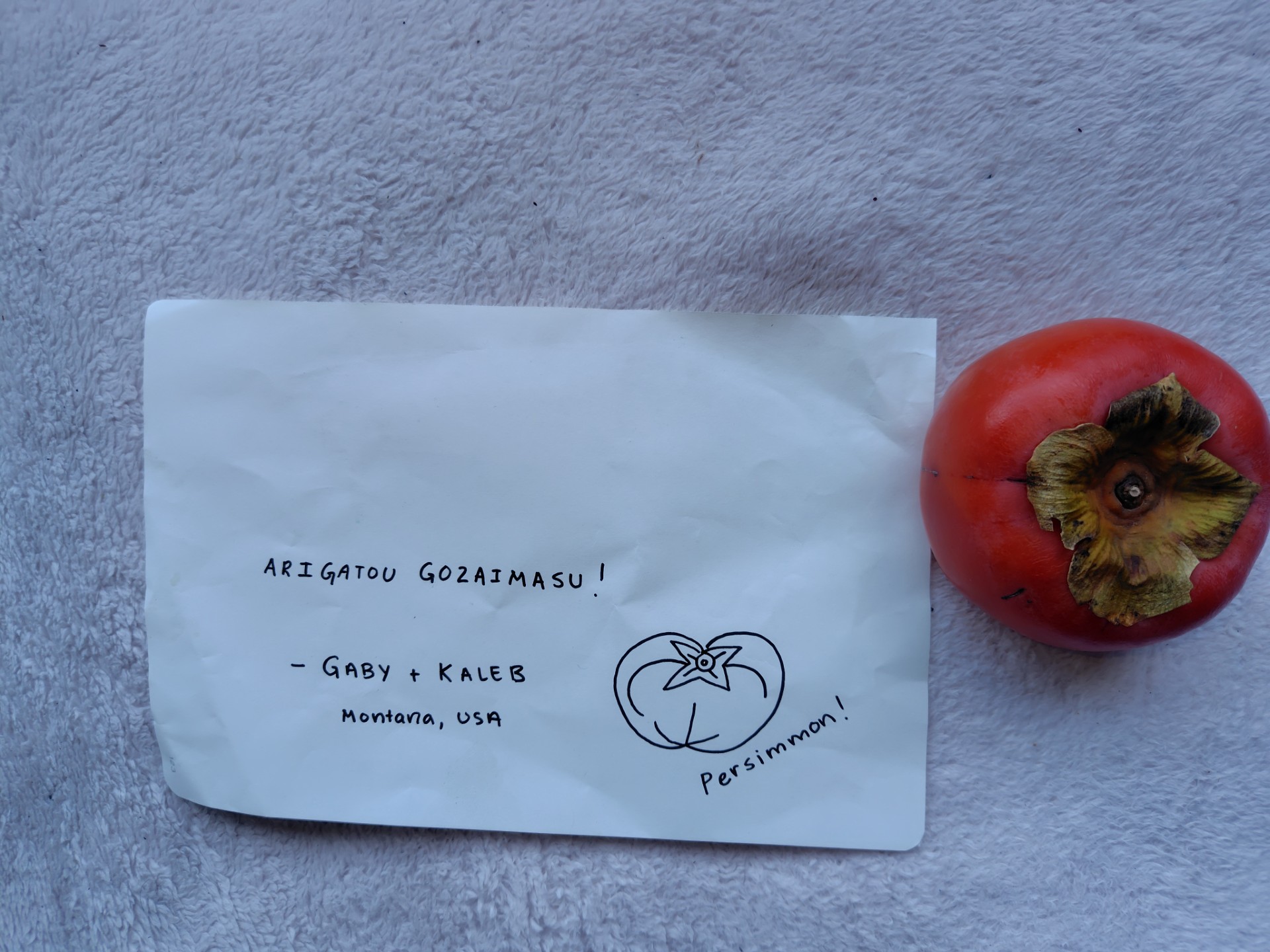 秋の行楽シーズンも終わりそろそろ閑散期を迎えている高野山麓ですが山里は未だ紅葉が残っています。高野山町石道を歩く方もチラホラ。円安のためインバウンド客が世界各地から来館され、地元の柿を賞味いただいていたところ、米国の山間部の州モンタナから来られていた若いカップルが可愛い感謝画像を残していきました。